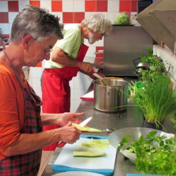 De gasten hoeven alleen maar aan te schuiven. Er kunnen maximaal 25 mensen mee-eten aan de mooi gedekte tafel. Samen eten is heel gezellig. Men maakt een praatje en ondertussen geniet iedereen van drie gangen heerlijk vers bereid eten.
